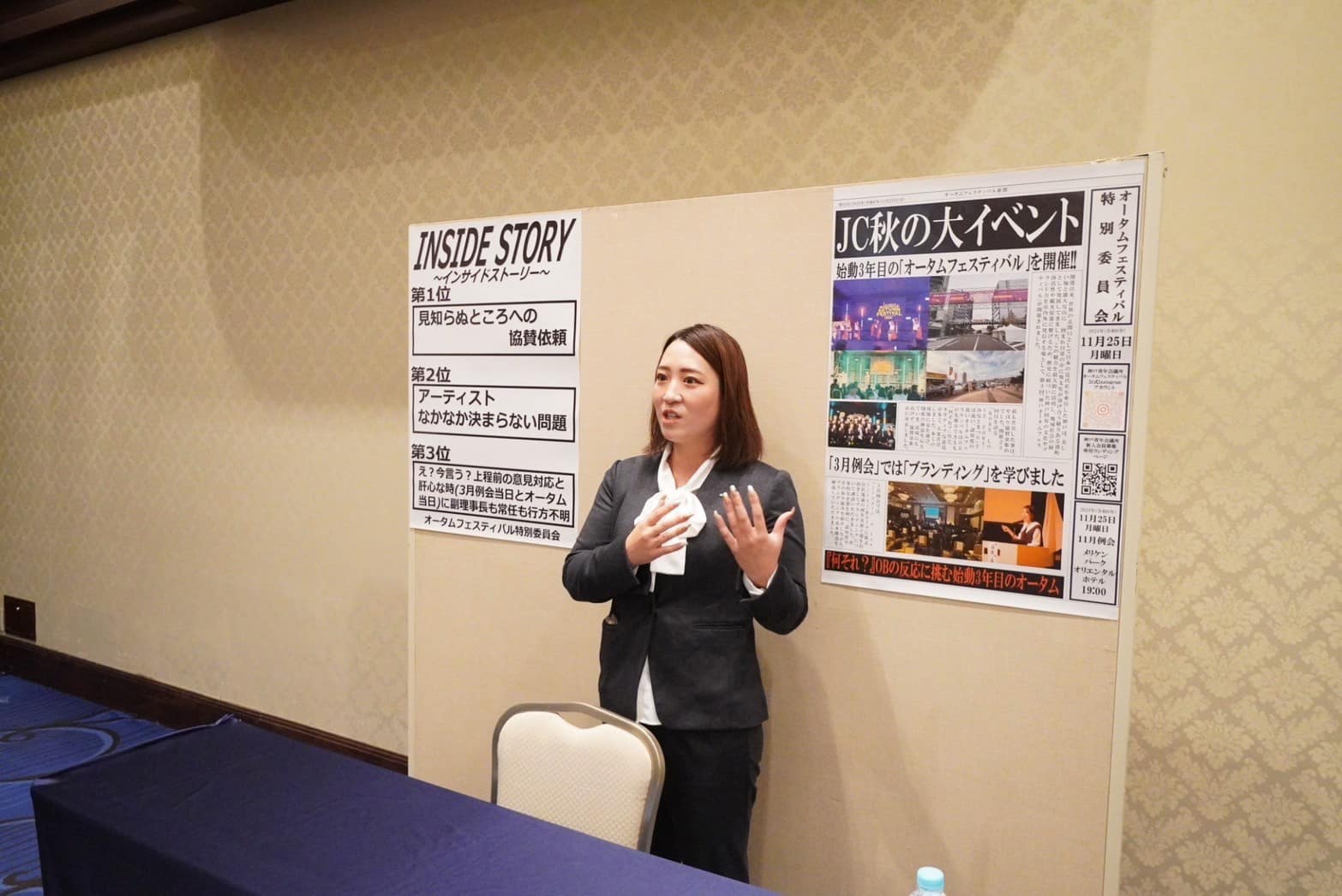 第2部では、博覧会形式で、各委員会の活動を展示したブースが設営され、各委員長が自身の1年間の活動の中で、印象的なインサイドストーリーを他委員会メンバーが回ってくる都度発表するという設えでした。